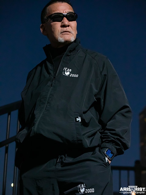 TEAM2000ロゴを、トップスにはフロント左胸ワンポイントとバックに大きくプリント、ボトムスは左腿部分のみにワンポイントプリントであしらった、TEAM2000セットアップデザイン。