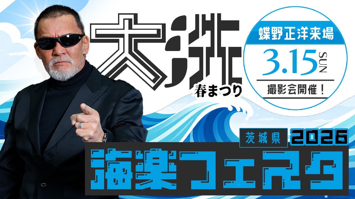 “いばらき大使” “大洗オフィシャルアンバサダー”の蝶野正洋が出演します3月15日(日)茨城県大洗町で開催の【大洗春まつり 海楽フェスタ2026】において、13:00より『蝶野正洋撮影会』の開催が決定いたしました!