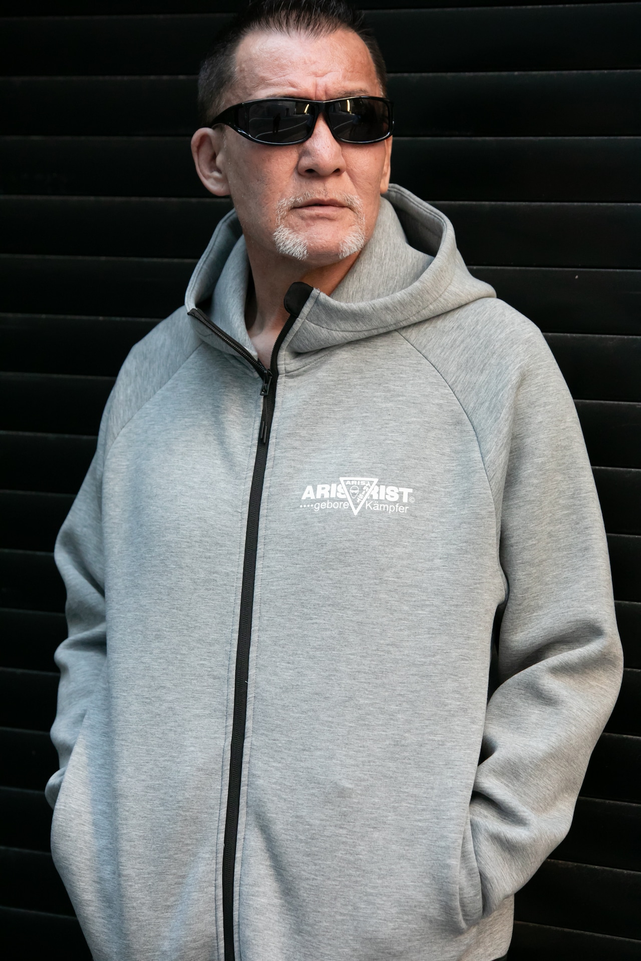 フロント左胸にワンポイント、バックに大きくセンターロゴプリントが入った定番デザインのジップアップタイプ。